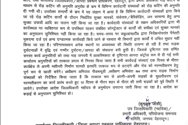 रोड कटिंग में सुरक्षा मानकों की अनदेखी पर जिला प्रशासन का बड़ा एक्शन; शहर अन्तर्गत समस्त कार्य अनुमतियां निरस्त कार्यदायी संस्थाओं को 1 दिन में निर्माण साईटों से मशीनरी हटाने तथा यथाशीघ्र सड़कों को पूर्व स्थिति में लाने के निर्देश पैनेल्टी मुकदमा एवं अन्य दण्डात्मक कार्यवाही के बाद भी खास सुधार न होने पर…