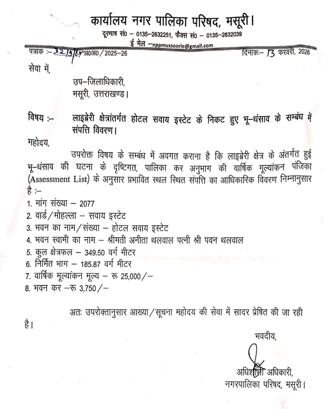संयुक्त निरीक्षण के दौरान पाया गया कि संबंधित संपत्ति नगर पालिका अभिलेखों में 349.50 वर्ग मीटर क्षेत्रफल में अनीता थलवाल, सुनिता धनई एवं सतीश गोयल के नाम दर्ज है। जिनको एमडीडीए द्वारा आवासीय मानचित्र के माध्यम से भूतल पर 178.85 वर्ग मीटर एवं कुल 420.66 वर्ग मीटर निर्माण की स्वीकृति प्रदान की गई थी। उक्त स्वीकृति राष्ट्रीय राजमार्ग, लोक निर्माण विभाग, नगर पालिका परिषद मसूरी, जल संस्थान मसूरी, उप वन संरक्षक मसूरी वन प्रभाग, तथा भूतत्व एवं खनिकर्म विभाग द्वारा अनापत्ति प्रमाण-पत्र एवं जियोटेक्निकल जांच रिपोर्ट प्राप्त होने के उपरांत दी गई थी।